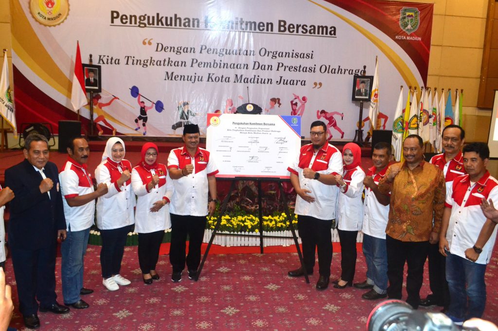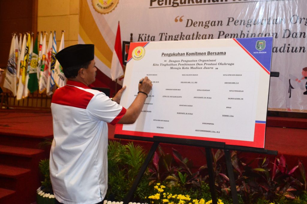 KONI Kota Madiun bersama Forkopimda dan DPRD Kota Madiun menandatangani kesepakatan komitmen bersama untuk memajukan olahraga Kota Madiun. Diikuti oleh Pengurus KONI dan Ketua Cabang Olahraga