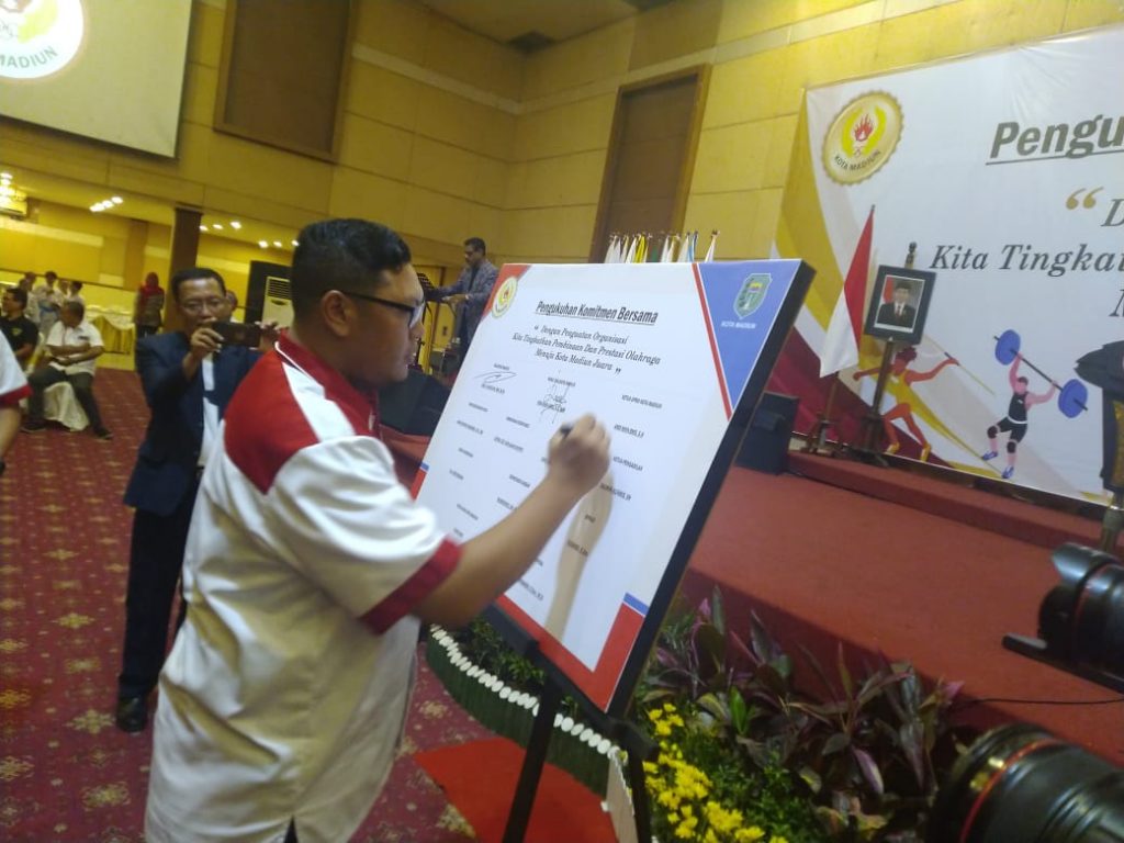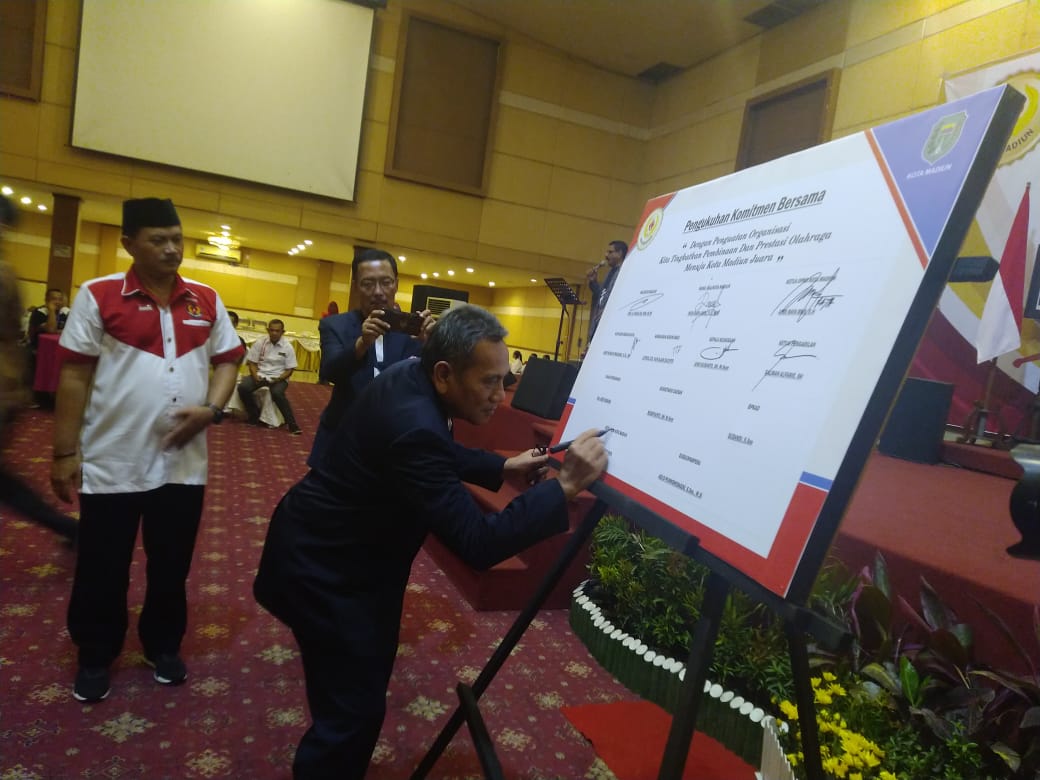 Penandatangan komitmen bersama ini dilaksanakan di hotel Merdeka, Kota Madiun pada Jum’at (29/11/2019) malam. Dihadiri Wali Kota dan Wakil Wali Kota Madiun, Ketua DPRD Kota Madiun, Sekretaris Daerah, dan segenap pemangku bidang olahraga Kota Madiun.